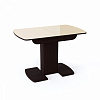 Недорогая функциональная и стильная модель. Каркас стола изготовлен из ЛДСП, цвет белый или венге. Столешница из МДФ с закаленным стеклом, матовым или глянцевым на выбор. Имеет полуовальную форму, размер 110 см с возможностью увеличения еще на 30 см. Опирается на одну ножку, переходящую в две плоские опоры на полу.